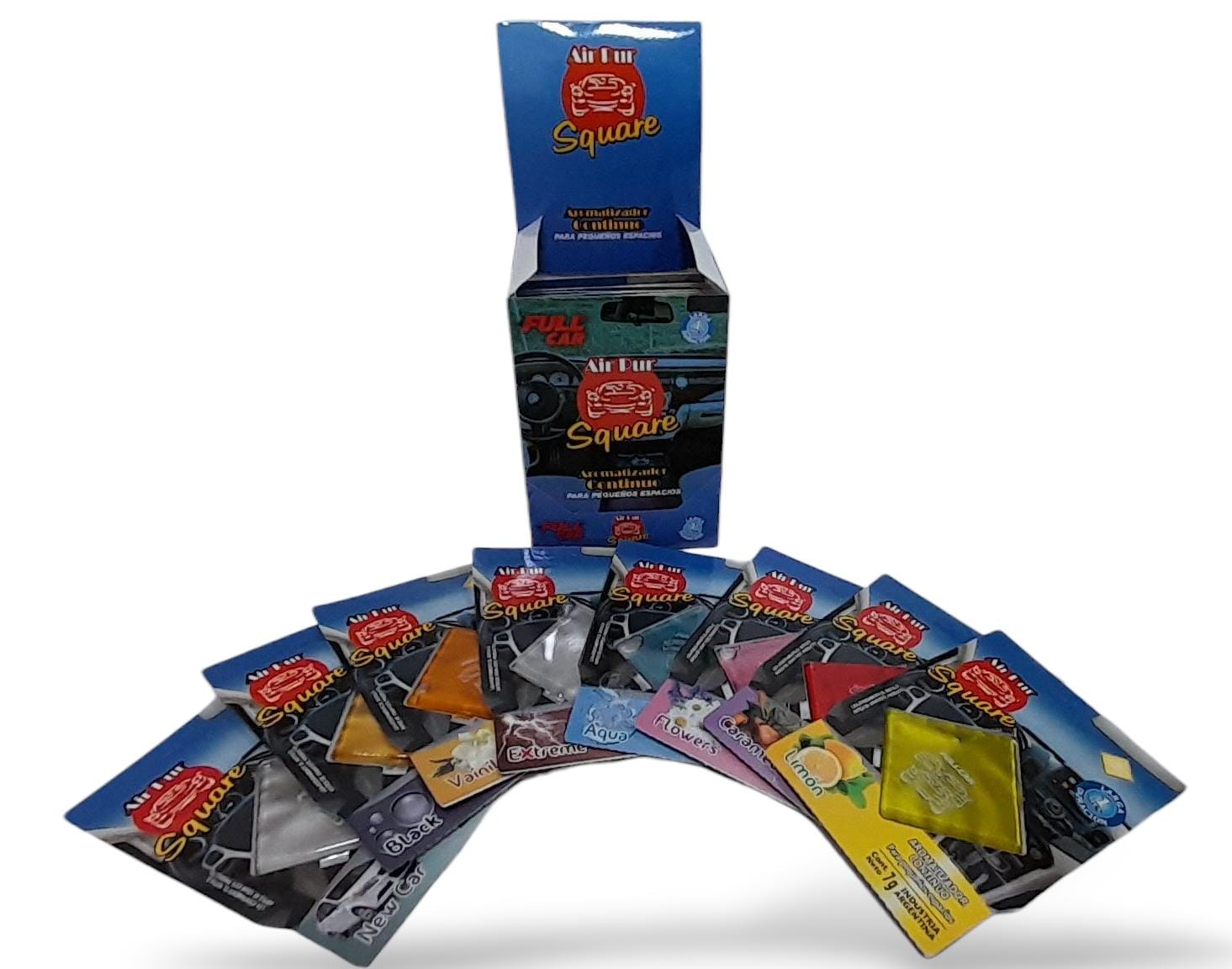 CAJA EXHIBIDORA X 24 UNIDADES PERFUME (AROMATIZADOR) AIR PUR SQUARE – FUL 9027 – FUL 9510FULL CAR (SIMIL K78 109 – K78 110 ) ( Aromatizador de acción continua, para colgar, en el automóvil,pequeños ambientes, baños, etc., gran variedad de fragancias.)