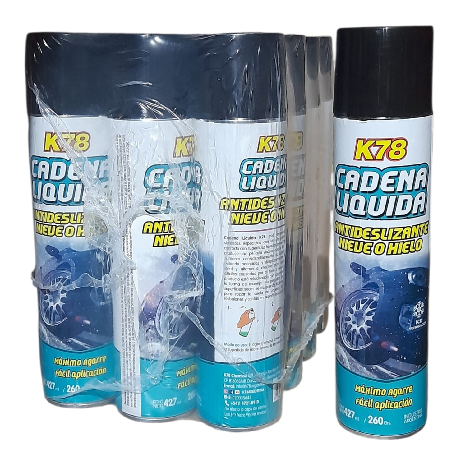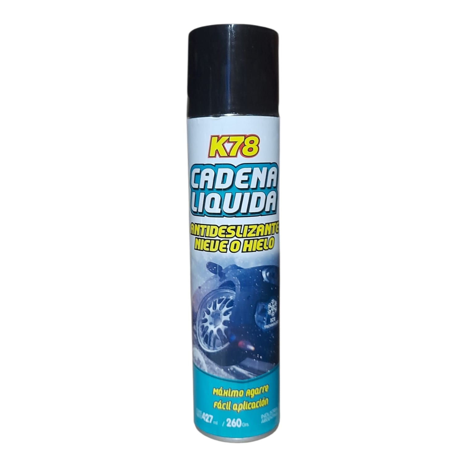CADENA LÍQUIDA EN AEROSOL 427 cc – K78 704 (CADENA PARA NIEVE SIMIL ST70 – FUL 924) (Producto antideslizante para neumáticos y calzados. Fórmula compuestaCADENA LIQUIDA ANTIDESLIZANTEActúa formando una película sobre el neumático aumentando en gran medida de resinas con un gran poder adherente en contacto con superficies heladas.Se puede aplicar en superficies hùmedas o secas. su agarre y adherencia al suelo. No perjudica al neumàtico, no es corrosivo)