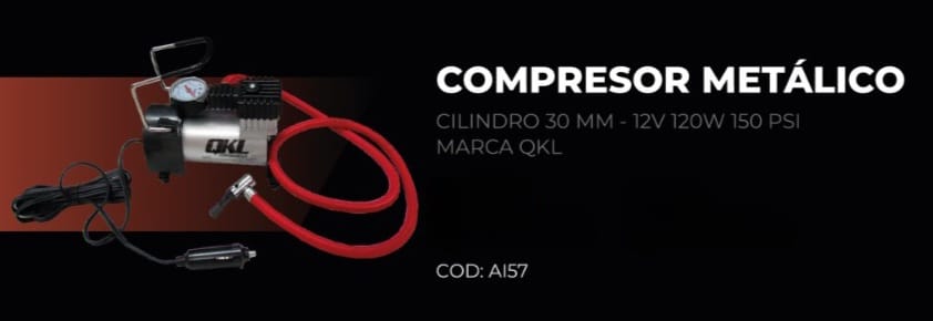 Compresor de aire 150PSI,>> cilindro de 30mm;>> Manguera de goma de alta calidad de 1 mts.>> Flujo de aire máx: 27L x min.>> Con 3 adaptadores (2 de boquilla y 1 aguja)>> Cable de 3 mts con conector a encendedor 12V; – QKL AI 57