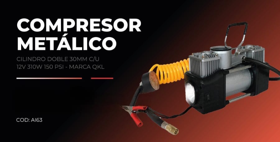 COMPRESOR METALICO DOBLE CILINDRO CON LUZ >> Compresor de aire 150PSI,>> 2 cilindros metálicos de 30mm c/u; con luz>> Voltaje DC12-13,5V / 23A>> Voltaje máximo: 13,5V>> Amperaje máximo: 23A>> Flujo de aire máximo: 45L x minuto>> Temperatura de operación: -55 a 60°C>> Tiempo de uso por ciclo: 15 minuto.>> Manguera de aire “Spring” de 5M con adaptadores de conexión rápidos y fáciles.>> Material de la manguera PE; diámetro 8 MM (diámetro interno es 5 MM)>> Manómetro de alta calidad 150 PSI;>>Cable de 3 m con clips de batería;>>Con protector de sobrecarga térmica>>Con 3 boquillas adaptadoras>>LUZ con 5 Leds;>> luz blanca, 30 – 35 Lumens (6 – 7LM per LED),>> Opera a DC 12V.>> Práctico compartimiento de guardado. – QKL AI 63