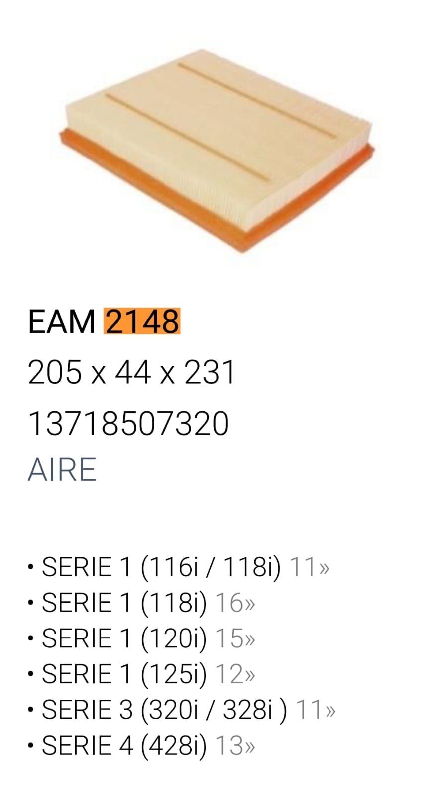 ![[FILTRO EMAFI] F. AIRE MB 114i/116i/118i 11-/SERIE3 (328i) 12- / SERIE4 (428i) 14- - EAM 2148(EAM 2148 - FAP-9066 CA 11305 - - C 24025 13718507320)](https://arenadistribuidora.com/wp-content/uploads/2023/08/EAM-2148.jpg)