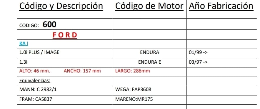 PROMO FILTROS DE AIRE NEW FILT CON CAJA TIPO PANEL FORD FORD KA / FIESTA 1,4 NAFTERO – AIPA 600E ALTO: 46 mm. ANCHO: 157 mm LARGO: 286mmEquivalencias:MANN: C 2982/1 WEGA: FAP3608FRAM: CA5837 MARENO:MR175
