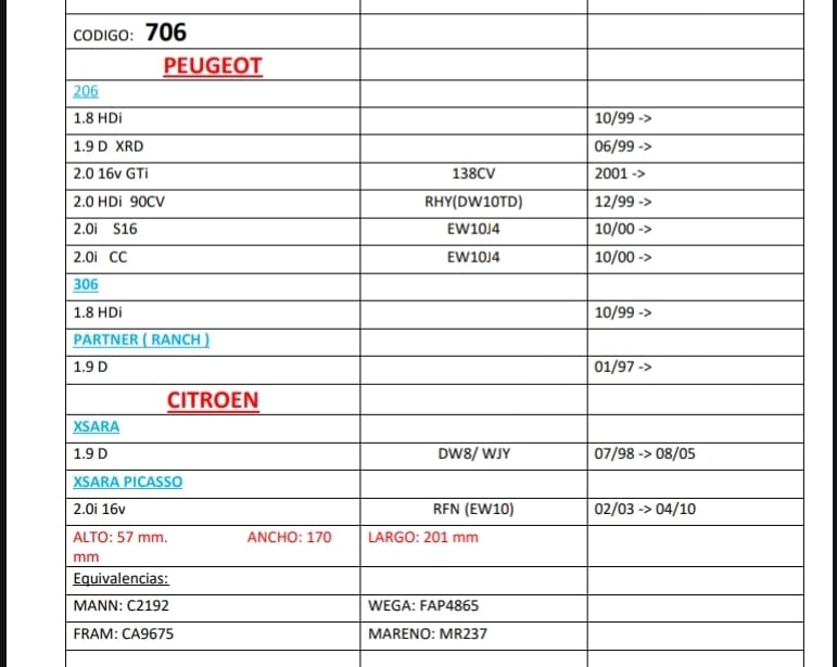PROMO FILTROS DE AIRE NEW FILT CON CAJA TIPO PANEL PEUGEOT PEUGEOT 206 DIESEL 1.9- 2.0 HDI (con espuma) – AIPA 706E ALTO: 57 mm. ANCHO: 170mmLARGO: 201 mmEquivalencias:MANN: C2192 WEGA: FAP4865FRAM: CA9675 MARENO: MR237 EMAFI: EAM 2052
