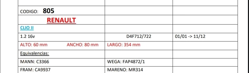 PROMO FILTROS DE AIRE NEW FILT CON CAJA TIPO PANEL RENAULT CLIO II 1,2 16 v – AIPA 805E ALTO: 60 mm ANCHO: 80 mm LARGO: 354 mmEquivalencias:MANN: C3366 WEGA: FAP4872/1FRAM: CA9937 MARENO: MR314 EMAFI: EAM 2015