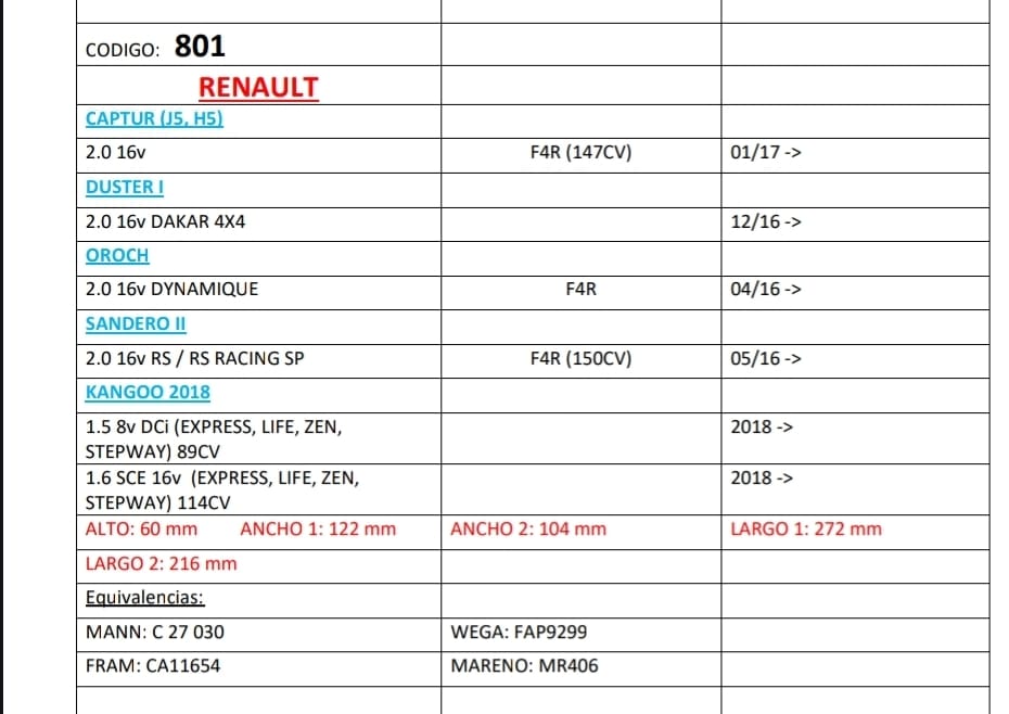 PROMO FILTROS DE AIRE NEW FILT CON CAJA TIPO PANEL RENAULT DUSTER 2.0L/OROCH 2.0/CLIO IV 1.2-1.4/SENDERO – AIPA 801E ALTO: 60 mm ANCHO 1: 122 mm ANCHO 2: 104 mm LARGO 1: 272 mmLARGO 2: 216 mmEquivalencias:MANN: C 27 030 WEGA: FAP9299FRAM: CA11654 MARENO: MR406EMAFI: EAM 2024/1