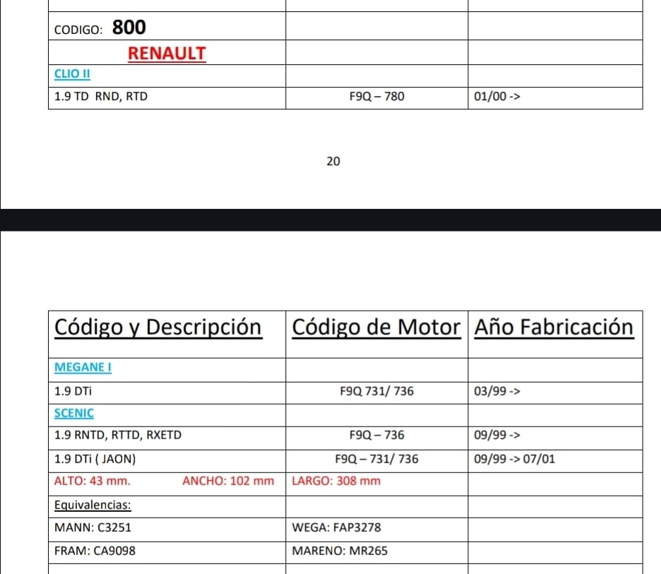 PROMO FILTROS DE AIRE NEW FILT CON CAJA TIPO PANEL RENAULT MEGANE 1,9 TDI / CLIOII 1,9TDI / SCENIC 1,9 TDI – AIPA 800E ALTO: 43 mm. ANCHO: 102 mm LARGO: 308 mmEquivalencias:MANN: C3251 WEGA: FAP3278FRAM: CA9098 MARENO: MR265