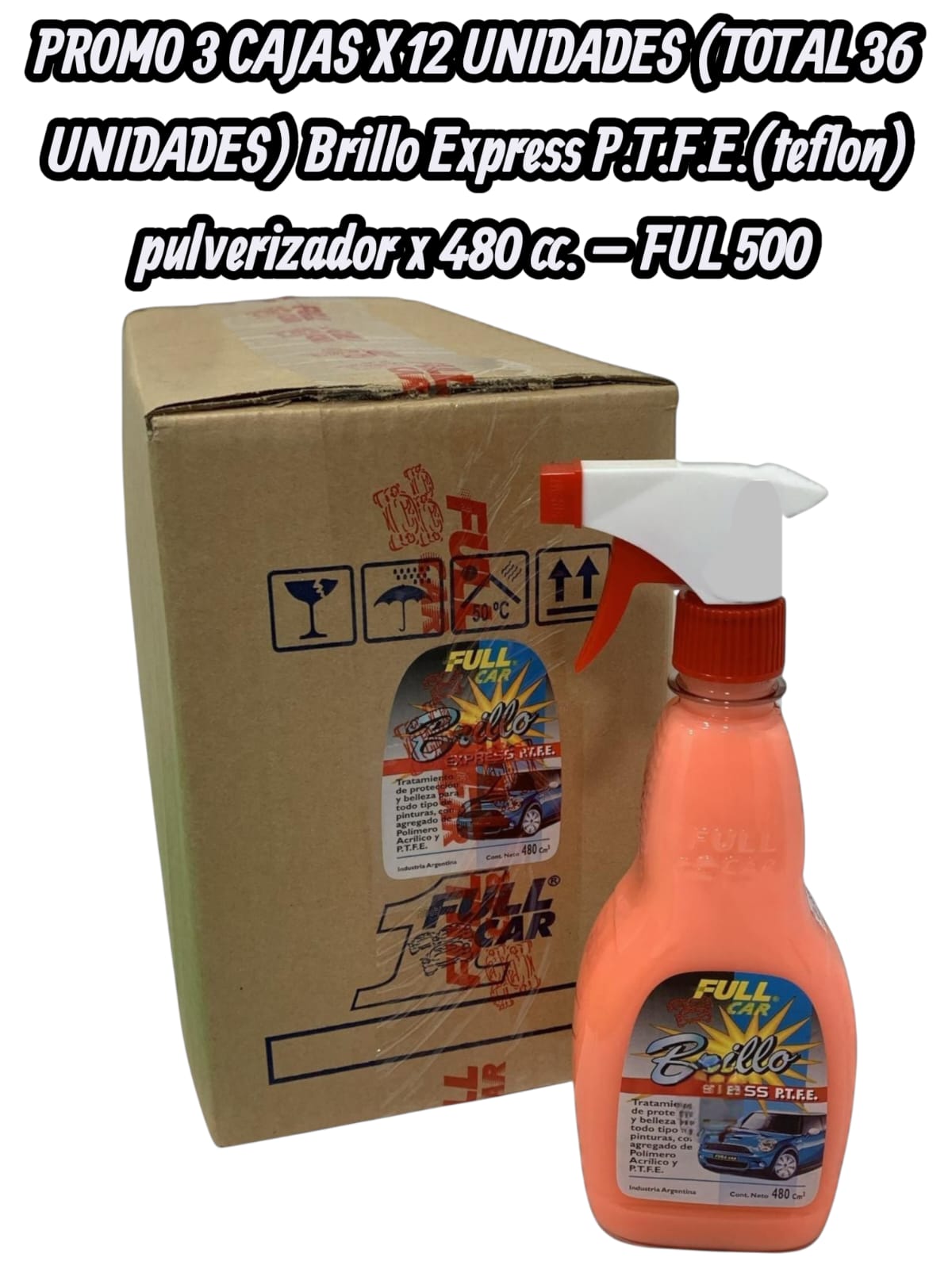 PROMO 3 CAJAS X 12 UNIDADES (TOTAL 36 UNIDADES) Brillo Express P.T.F.E.(teflon) pulverizador x 480 cc. – FUL 500 – FUL 502 FULL CAR (CERA LIQUIDA simil k78 404 – k78 451 / 3M 39034) (Tratamiento de protección y belleza para todo tipo de pinturas,con agregado de Polímero acrílico y P.T.F.E. (Teflon).El mejor acabado con la mayor facilidad de aplicación.)