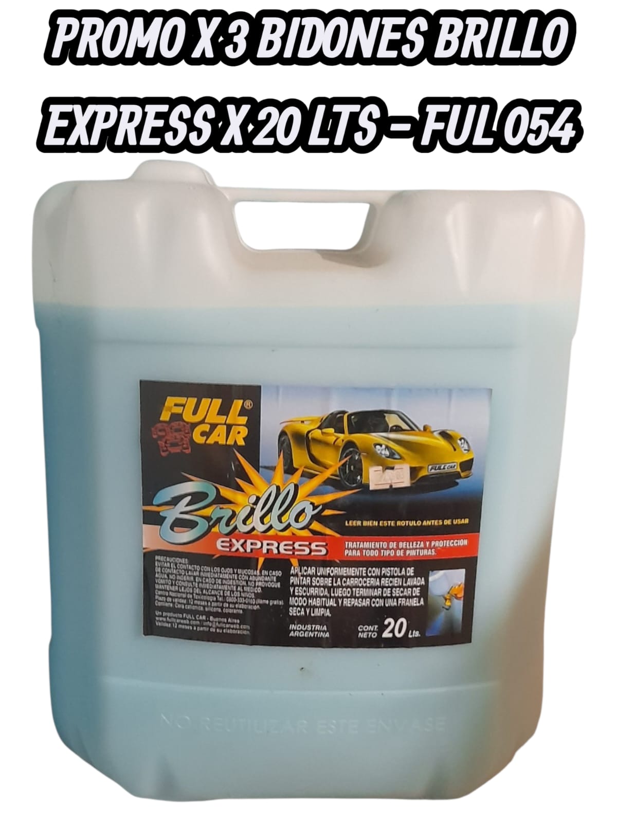 PROMO X 3 BIDONES Bidon cera rapida Brillo Express x 20 L – FUL 054 FULL CAR (simil k78 a823 – k78 a451 – k78 a900 – k78 a825 – k78 a826) (Sistema de protección y brillo para vehículos. Combinación de Art. 054ceras y siliconas que forman una película brillante. Muy fácilaplicación sobre seco o húmedo.)