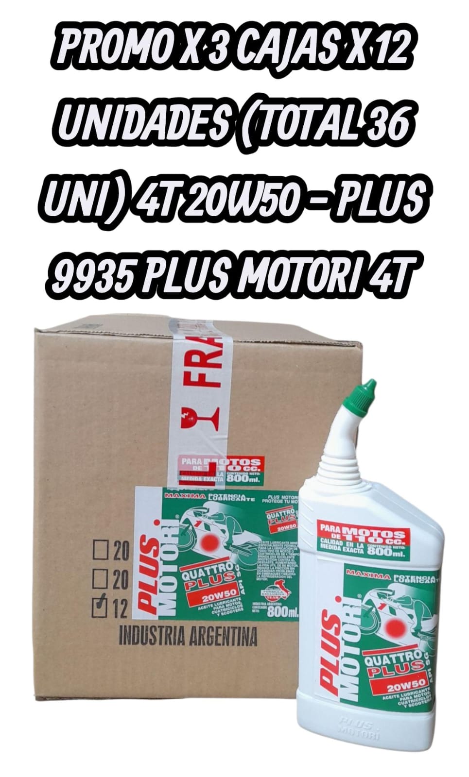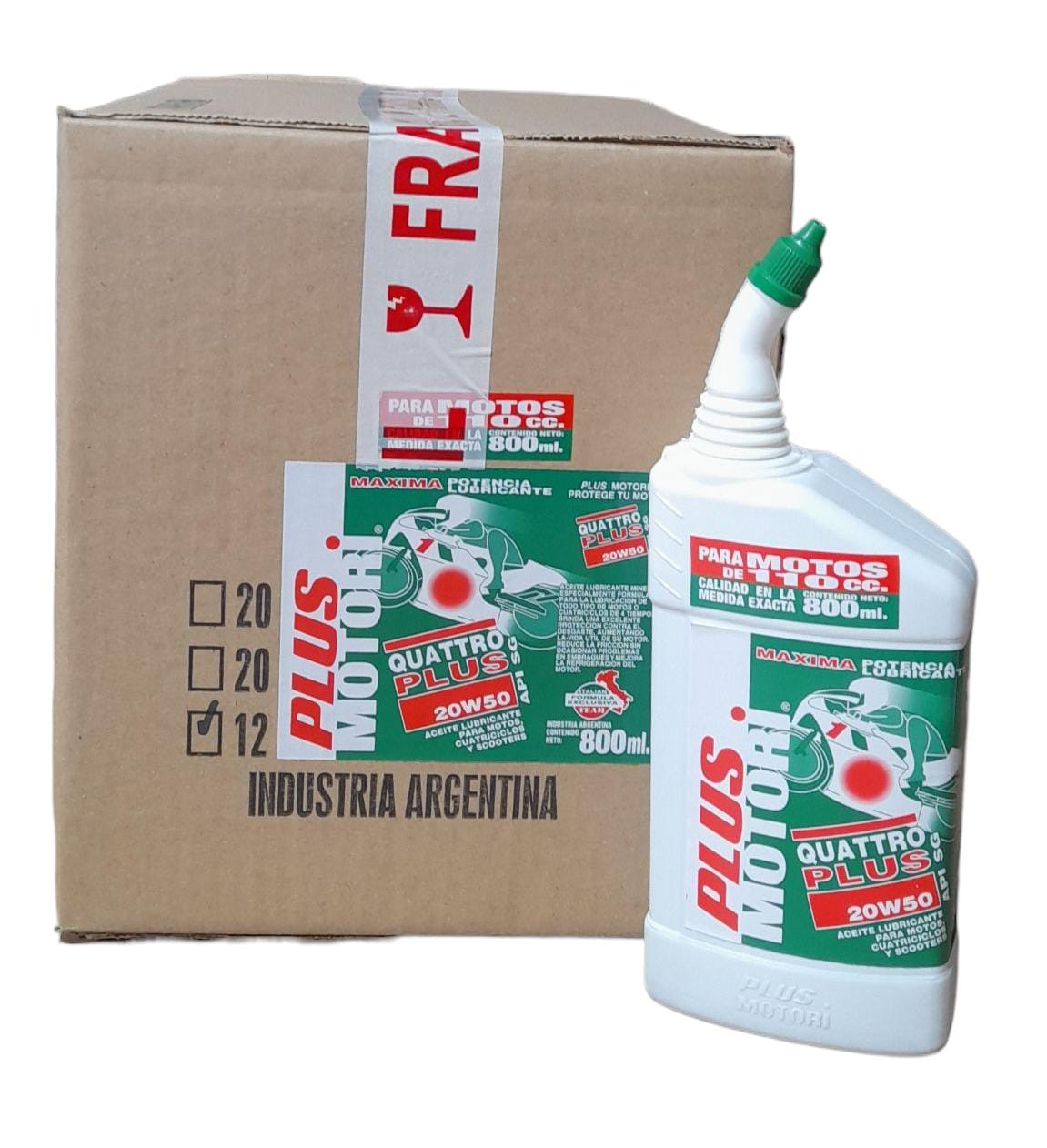 PROMO X 3 CAJAS X 12 UNIDADES (TOTAL 36 UNIDADES) ACEITE DE MOTO 4 TIEMPOS (4T) QUATTRO PLUS SAE 20W50 API SG X 800 ML – PLUS 9935 PLUS MOTORI 4T