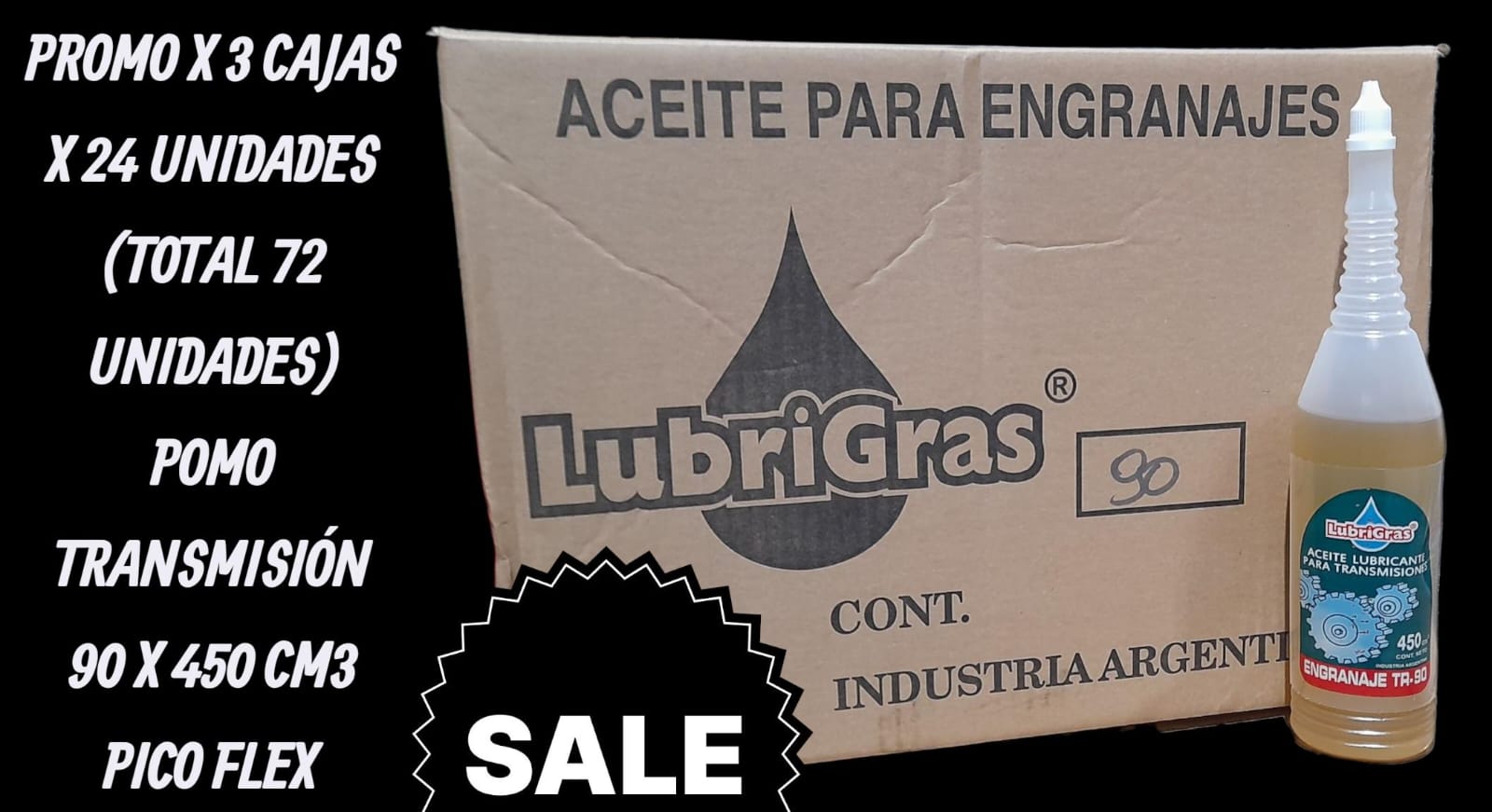 PROMO X 3 CAJAS X 24 UNIDADES (TOTAL 72 UNIDADES ) POMO TRANSMISION 90 (TR90) X 450 CM3.PICO FLEX – TRAN03 LUBRIGRAS (Aceite transmisiónpara caja de velocidad y diferencialAceite para caja de veloc idad, diferencial y reduc­tores de engranajes. Apto para todo tipo de engra­ najes, los aditivos que contiene le brindan buenaresistencia a la pelicula lubricante con excelente inhibición contra oxidación y toda acción contra agentes externos.)