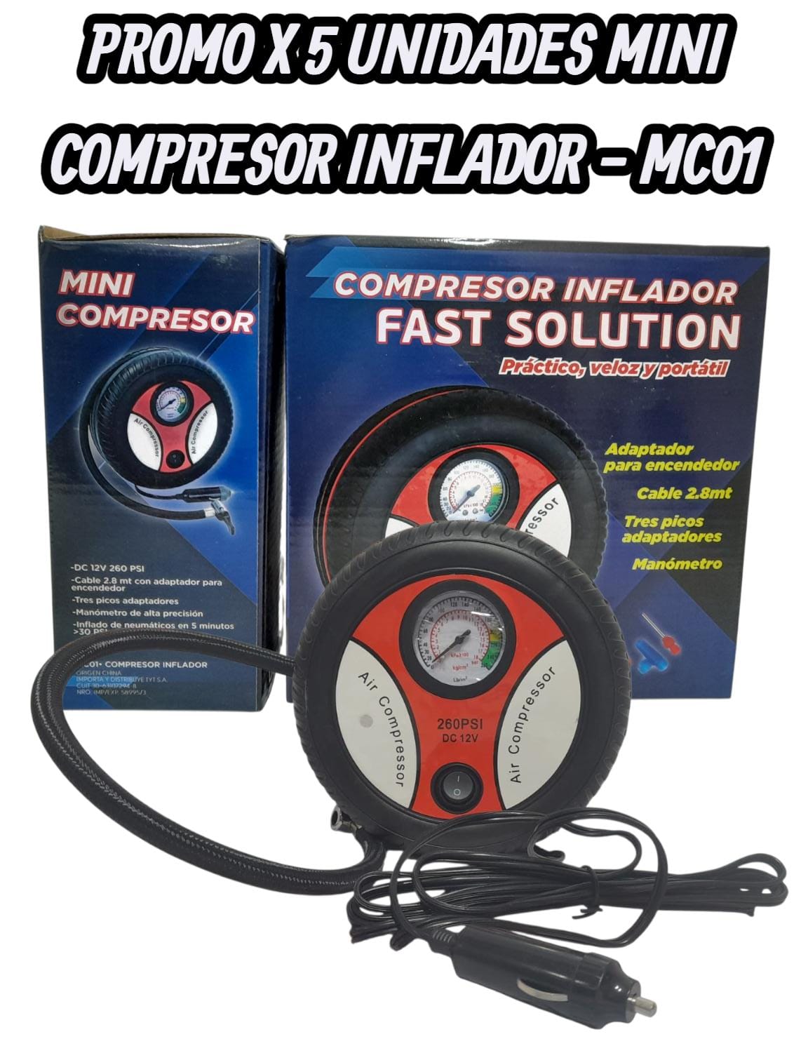 PROMO X 5 UNIDADES >>Compresor de aire 260 PSI,>>Redondo 16,5 de diámetro>>Manguera de goma de alta calidad de 43CM.>>Con 3 adaptadores (2 de boquilla y 1 aguja)>>Cable de 2,4 mts con conector a encendedor 12V – QKL MC01