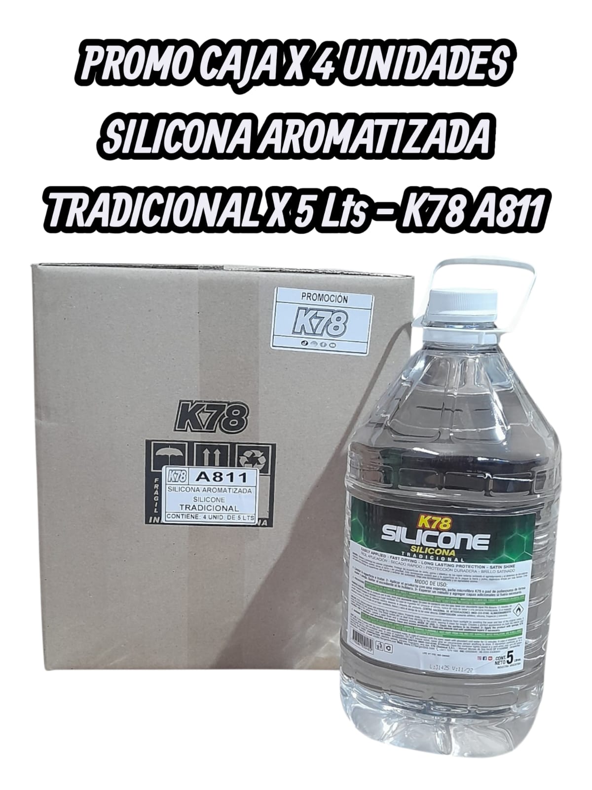 PROMO X3 CAJAS X 4 UNIDADES (TOTAL 12 UNIDADES ) SILICONA LÍQUIDA AROMATIZADA DE INTERIORES (Tradicional) X 5 LTS – K78 A811 (RENOVADOR -RECUPERADOR – VINILICOS E INTERIORES – REVIVIDOR – SIMIL K78 A843 – K78 A844 – K78 A840 – K78 A815 – K78 A813 – FUL 042 – FUL 400)